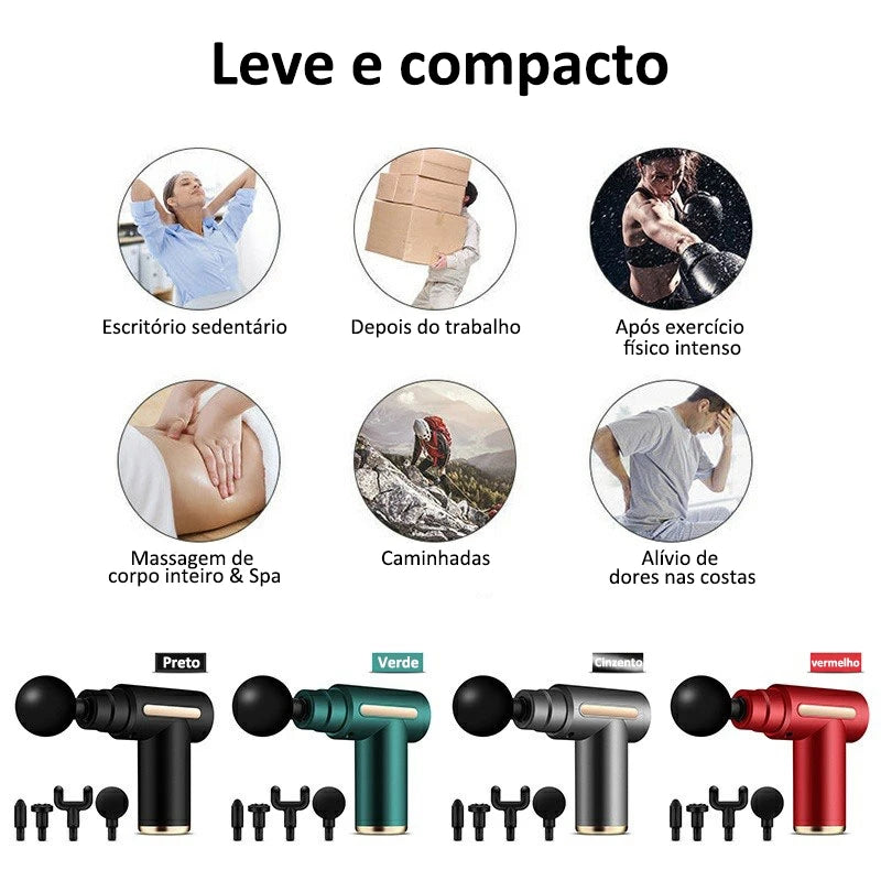 A Pistola de Massagem Vibratória Portátil utiliza tecnologia de vibração de alta frequência para aliviar dores, relaxar músculos e ativar a circulação em poucos minutos.